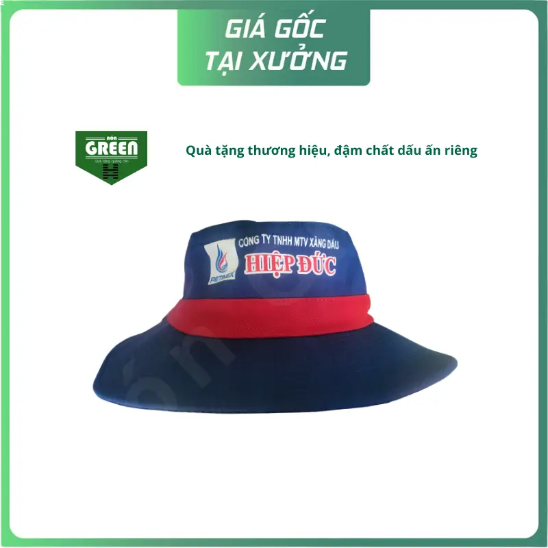 Chiếc nón tai bèo ba tông màu xanh dương, đỏ và xanh navy nổi bật với logo Công ty TNHH MTV Xăng Dầu Hiệp Đức (Hiệp Đức fuel), đem lại sự chuyên nghiệp và tinh tế cho thương hiệu. Phù hợp để dùng trong các hoạt động bán hàng, quảng bá thương hiệu tại cửa hàng xăng – dầu, sự kiện ngoài trời hoặc làm quà tặng đồng bộ, truyền thông doanh nghiệp.
