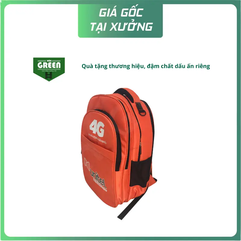Mẫu balo 4G Unitel nổi bật với màu cam rực rỡ, in logo và thông điệp thương hiệu rõ nét, giúp nâng cao khả năng nhận diện và quảng bá hình ảnh doanh nghiệp. Thiết kế hiện đại, nhiều ngăn tiện dụng, balo phù hợp cho nhân viên, học sinh, sinh viên và các chương trình marketing, sự kiện quảng bá thương hiệu.