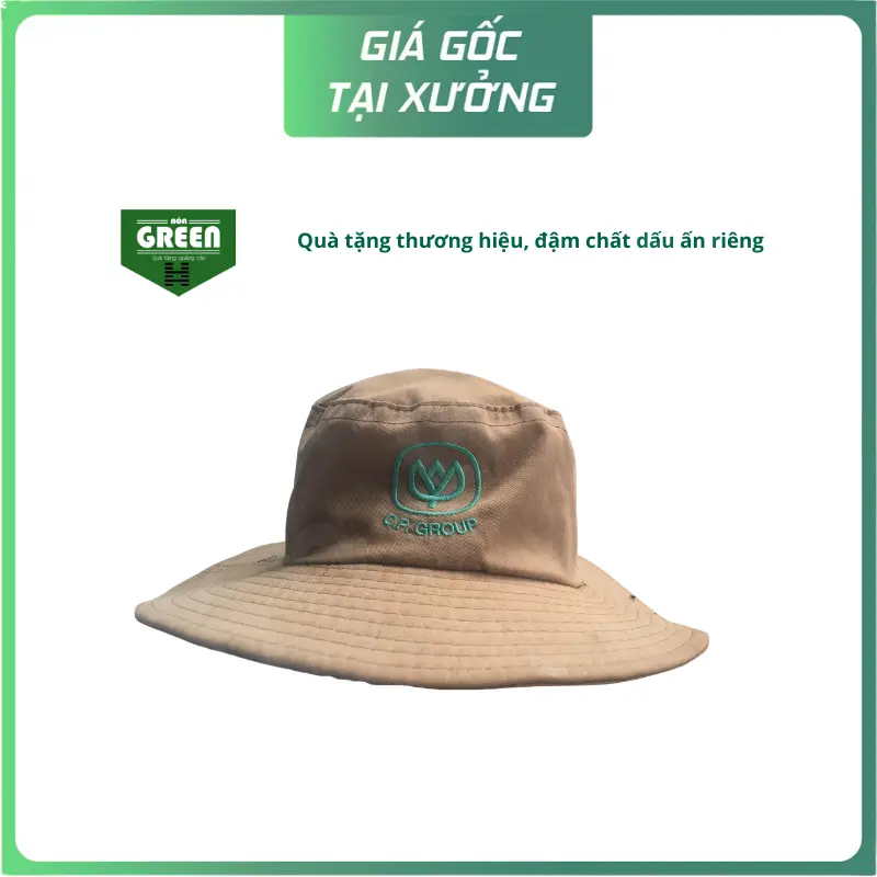 Chiếc nón tai bèo màu nâu trầm vừa phong cách vừa tinh tế, được thêu logo OB Group nổi bật ngay trước mặt nón. Thiết kế tối giản hướng đến sự chuyên nghiệp, phù hợp với môi trường doanh nghiệp, hội thảo hoặc làm quà tặng thương hiệu cao cấp.